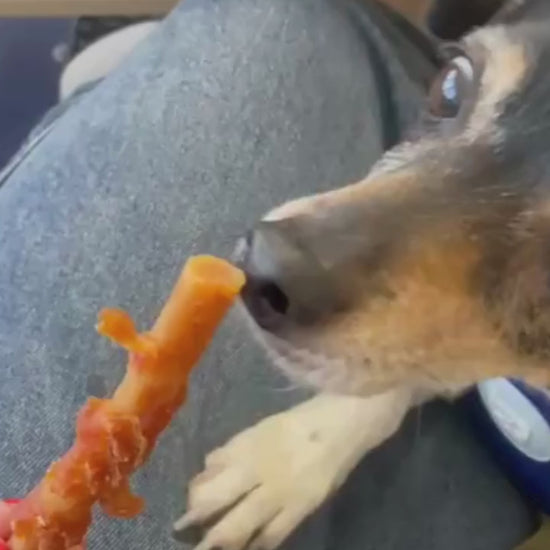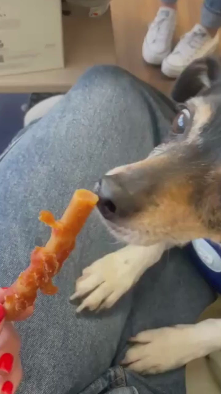 Sticks elaborados con carne de pollo y trozos naturales de zanahoria. Su textura firme ayuda a limpiar los dientes mientras aporta fibra y antioxidantes naturales.